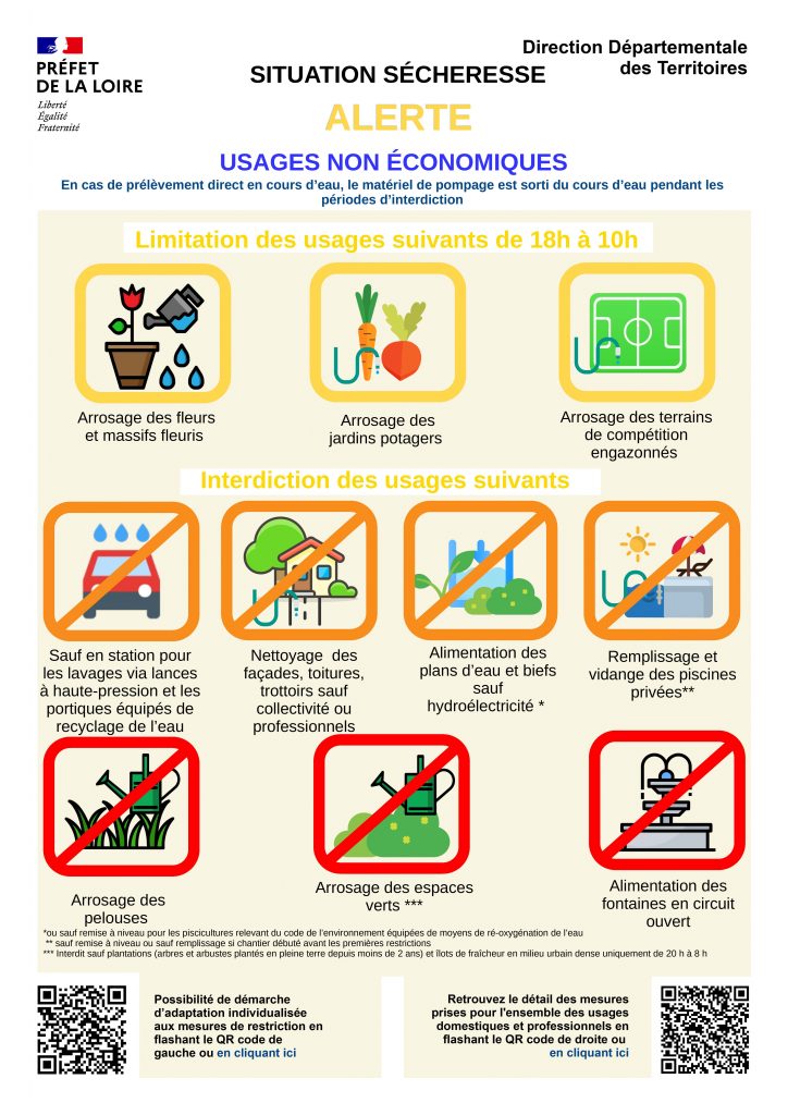 Retrouvez l’ensemble des informations relatives à la sécheresse sur le site de l’État : https://www.loire.gouv.fr/Actions-de-l-Etat/Environnement/Eau-et-milieux-aquatiques/La-secheresse-et-l-hydrologie/La-secheresse/